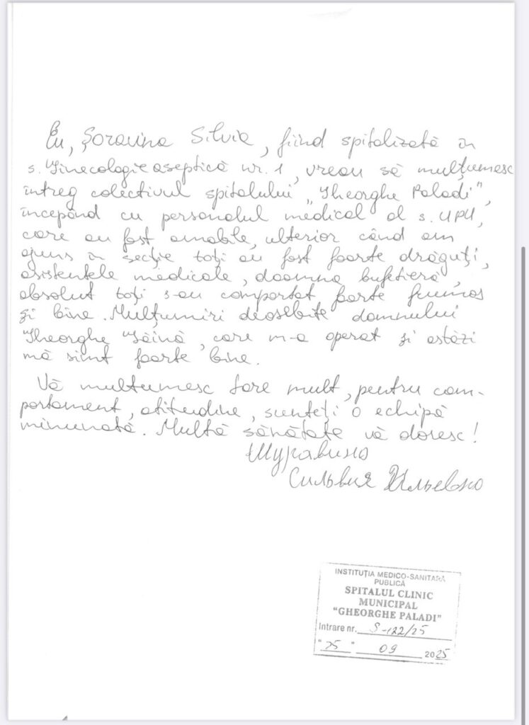 25.09.2025 ”Eu, Șoravina Silvia, fiind spitalizată în secția Ginecologie Aseptică nr.1, vreau să mulțumesc întreg colectivul spitalului ”Gheorghe Paladi”, începând cu personalul medical al UPU, care au fost amabile, ulterior, când am ajuns în secție, toți au fost foarte drăguți, asistentele medicale, dna buferietă, absolut toți s-au comportat foarte frumos și bine. Mulțumiri deosebite dlui Gheorghe Găină, care m-a operat și astăzi mă simt foarte bine. Vă mulțumesc mult pentru comportament, atitudine, sunteți o echipă minunată. Multă sănătate vă doresc!”, semnează pacienta.