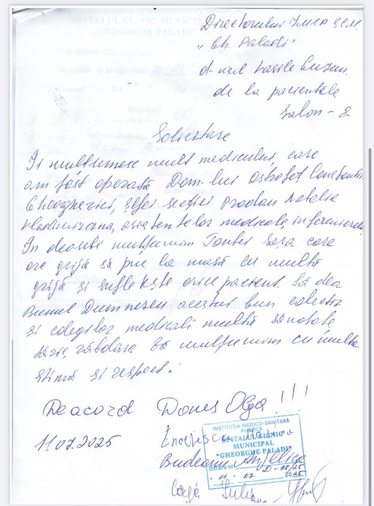 11.07.2025. ”Îi mulțumesc mult medicului care m-a operat, dlui Ostrofeț Constantin, șefei secției Prodan Natalia, asistentelor medicale, infirmierelor. Îndeosebi mulțumesc lui tanti Sașa care are grijă să puie pe masă cu multă grijă și sufletește pentru orice pacient. Să le dea bunul Dumnezeu acestui colectiv medical multă sănătate și răbdare. Vă mulțumesc!”, semnează cu multă stimă și respect Olga Dones, alături de pacientele Budeanu Angelica, Enochescu Maria și Iuliana.