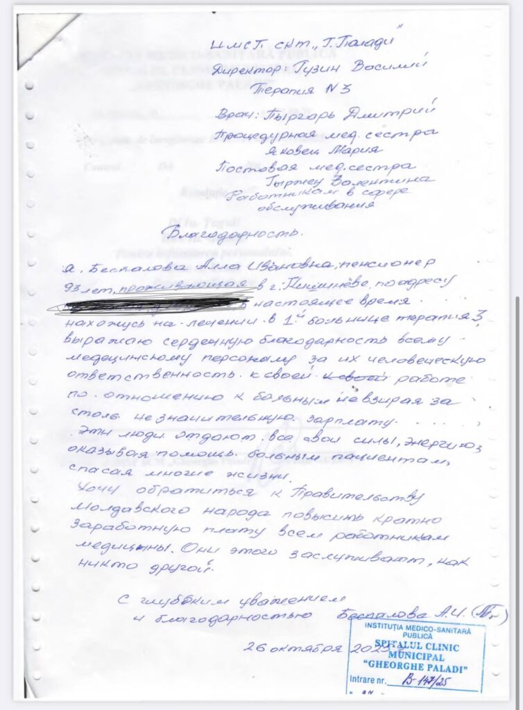”Aduc sincere mulțumiri șefei secției Terapie 3, Roșcona Aliona, medicului Pîrgari Dumitru, surorilor medicale Gîncu Valentișa și Iaccoveț Maria, pentru munca și efortul depus zi de zi îmbunătățind starea de sănătate a pacienților. De asemenea, sunt recunoscătoare de munca tuturor asistentelor medicale, lucrătorilor auxiliari, distribuitorilor de bucate, dnei Veronica. Încă odată mă închin și vă mulțumesc pentru bunătate și răbdare.”, semnează pacienta Elena Barbos.