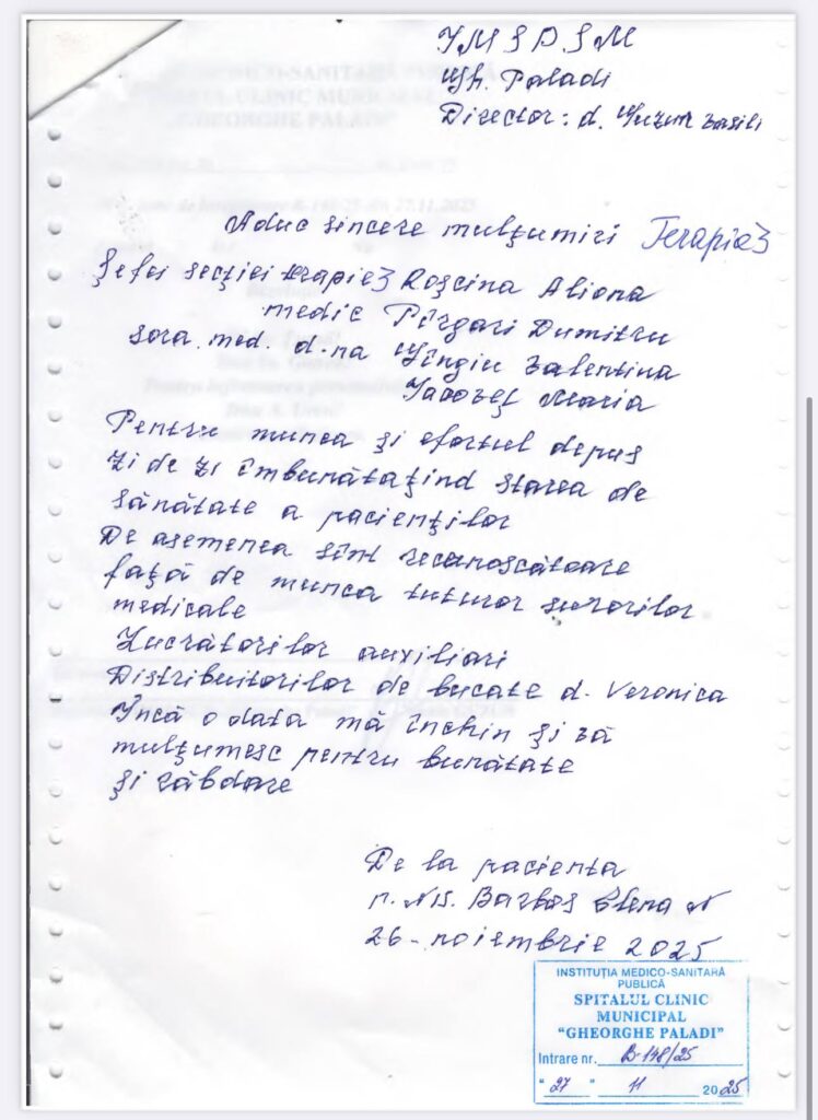 Două paciente internate recent în Secția Terapie 3 a Spitalului Clinic Municipal „Gheorghe Paladi” au transmis scrisori pline de recunoștință către întregul colectiv medical. În cuvinte simple, dar profund emoționante, acestea au mulțumit pentru profesionalism, implicare și grija sinceră pe care au simțit-o pe tot parcursul tratamentului.