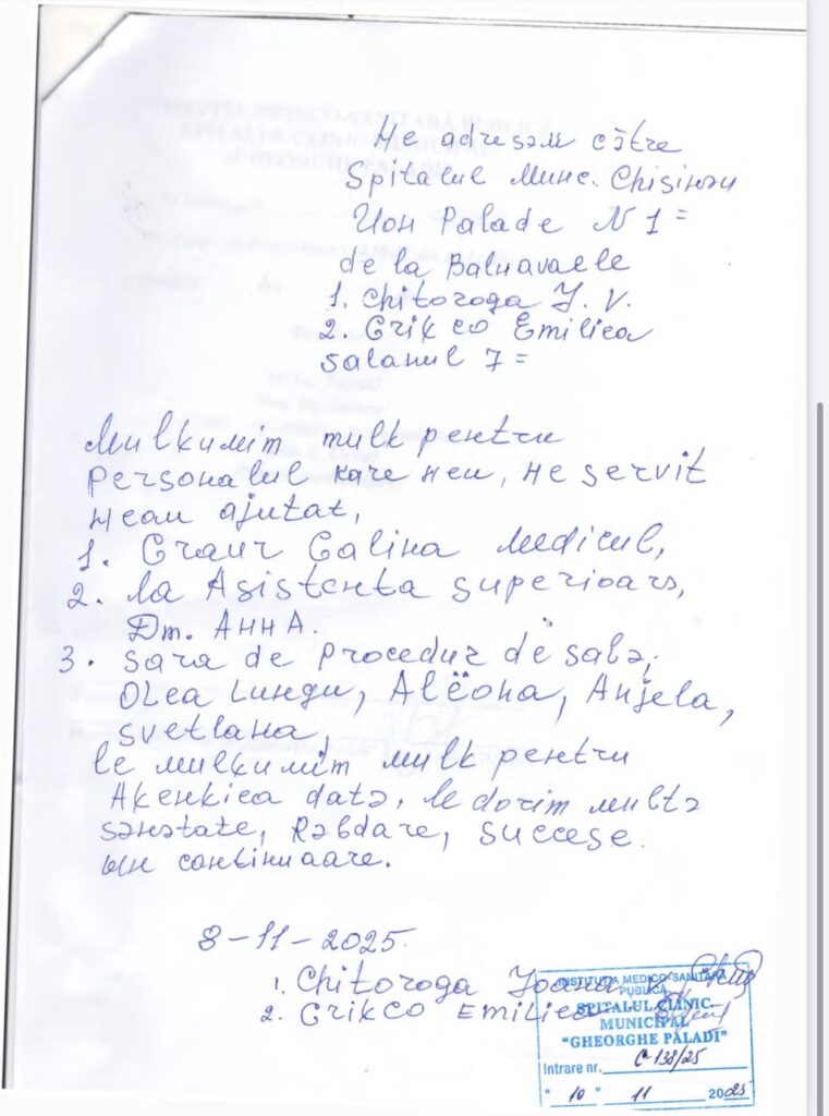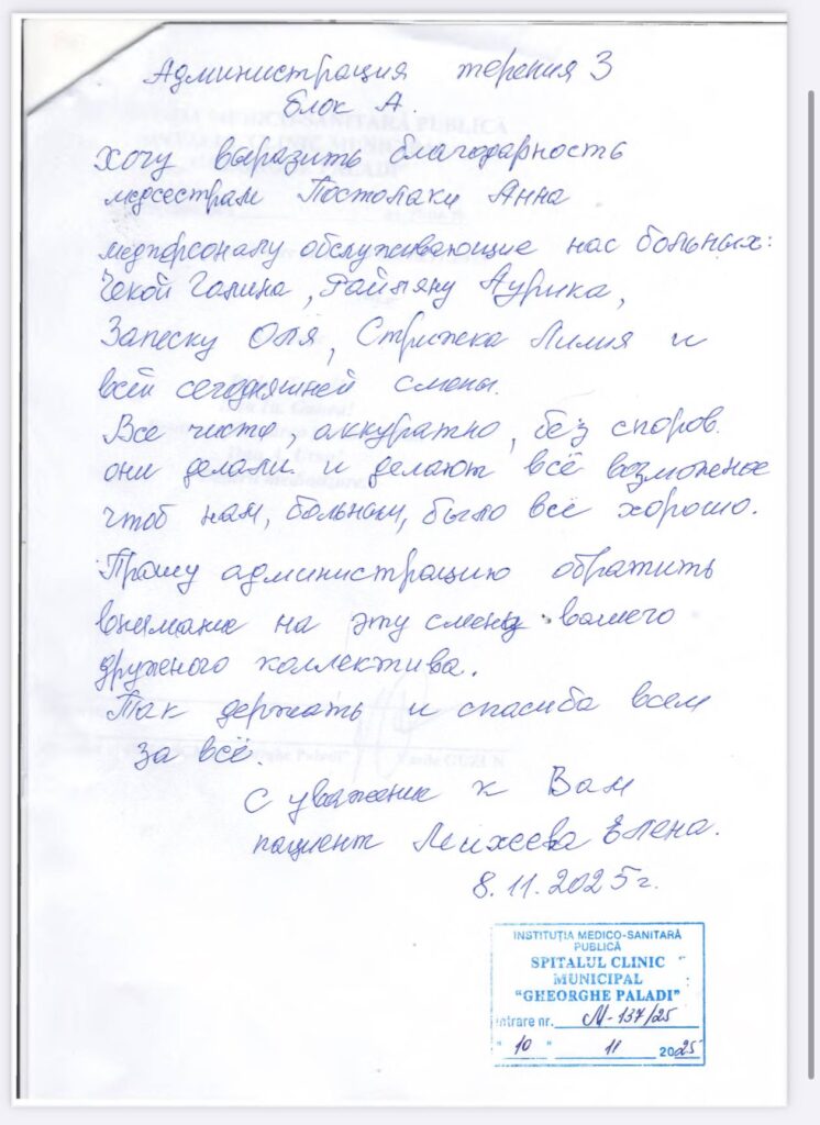 În adresa Spitalului Clinic Municipal „Gheorghe Paladi” au parvenit recent mai multe mesaje de recunoștință dedicate personalului medical și din cadrul Secției Terapie nr. 3, din partea pacienților care au trecut prin momente dificile de suferință, dar care au găsit aici alinare, grijă și sprijin profesionist. Dincolo de actul medical propriu-zis, pacienții au evidențiat atitudinea umană, atenția la detalii și sprijinul moral oferit în momente de vulnerabilitate. Iată ce ne scriu unii dintre acești pacienți: