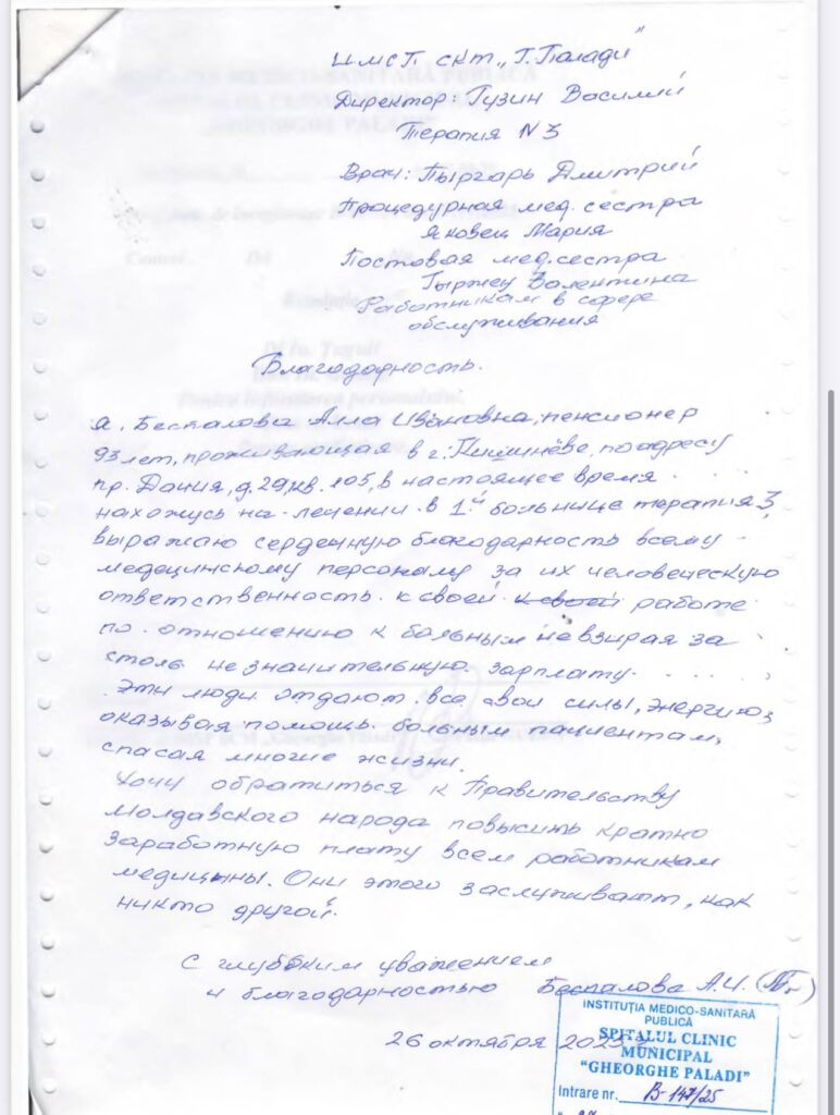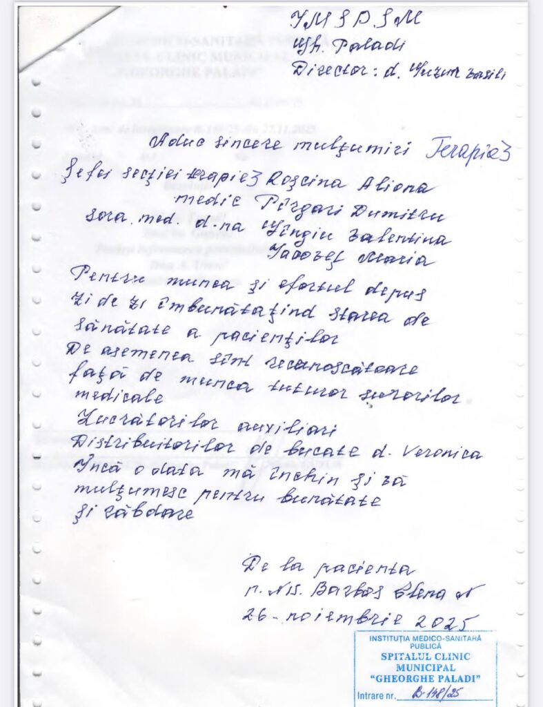 ”Șefei secției Terapie 3, Roșeina Albina, medicului Țîrgari Dumitru, sora med. de la îngrijire Valentina. Pentru munca și efortul depus zi de zi, îmbunătățind starea de sănătate a pacienților. De asemenea sunt recunoscătoare față de munca tuturor surorilor medicale, lucrătorilor auxiliari, distribuitorilor de bucate dnei Veronica. Încă o dată mă închin și vă mulțumesc pentru bunătate și răbdare.”, semnează pacienta Bărbaș Elena.