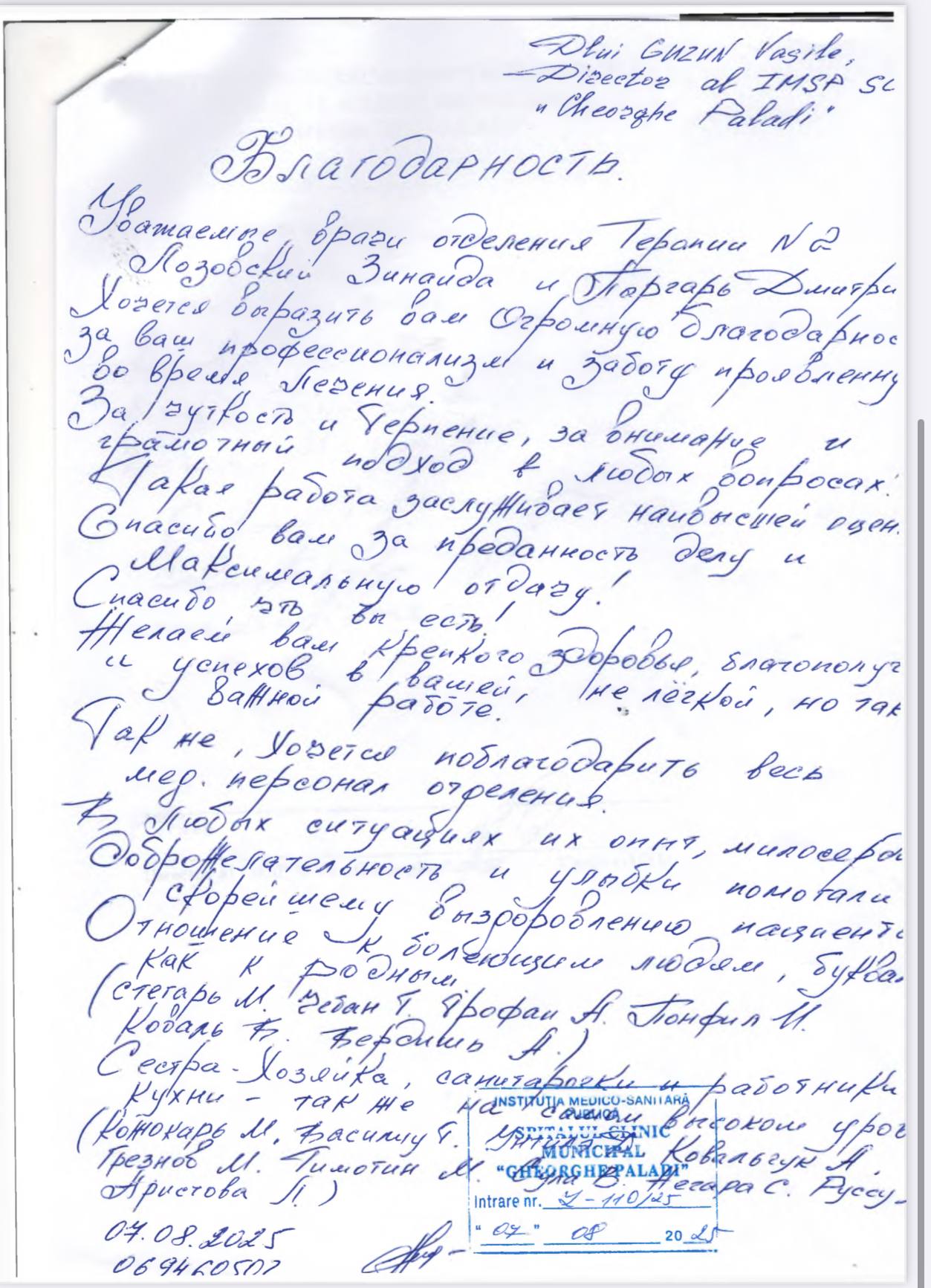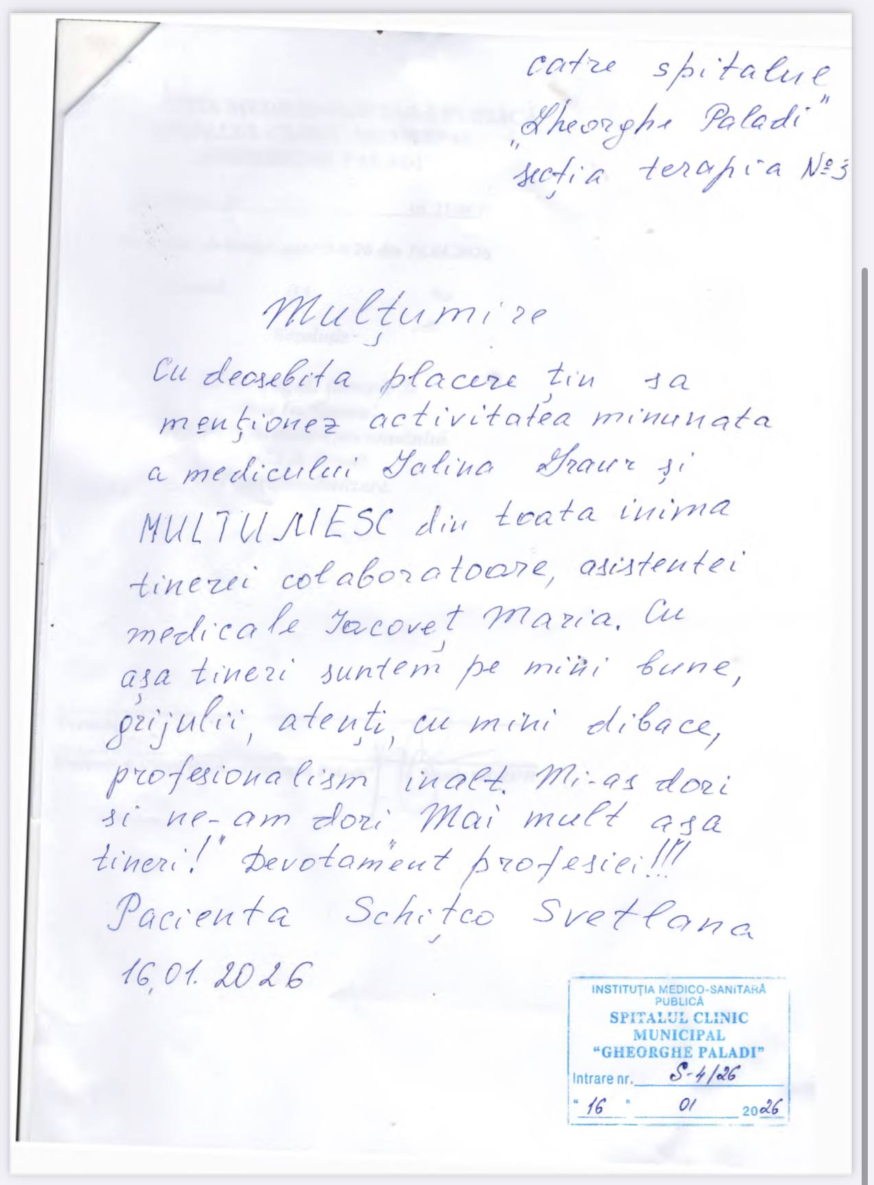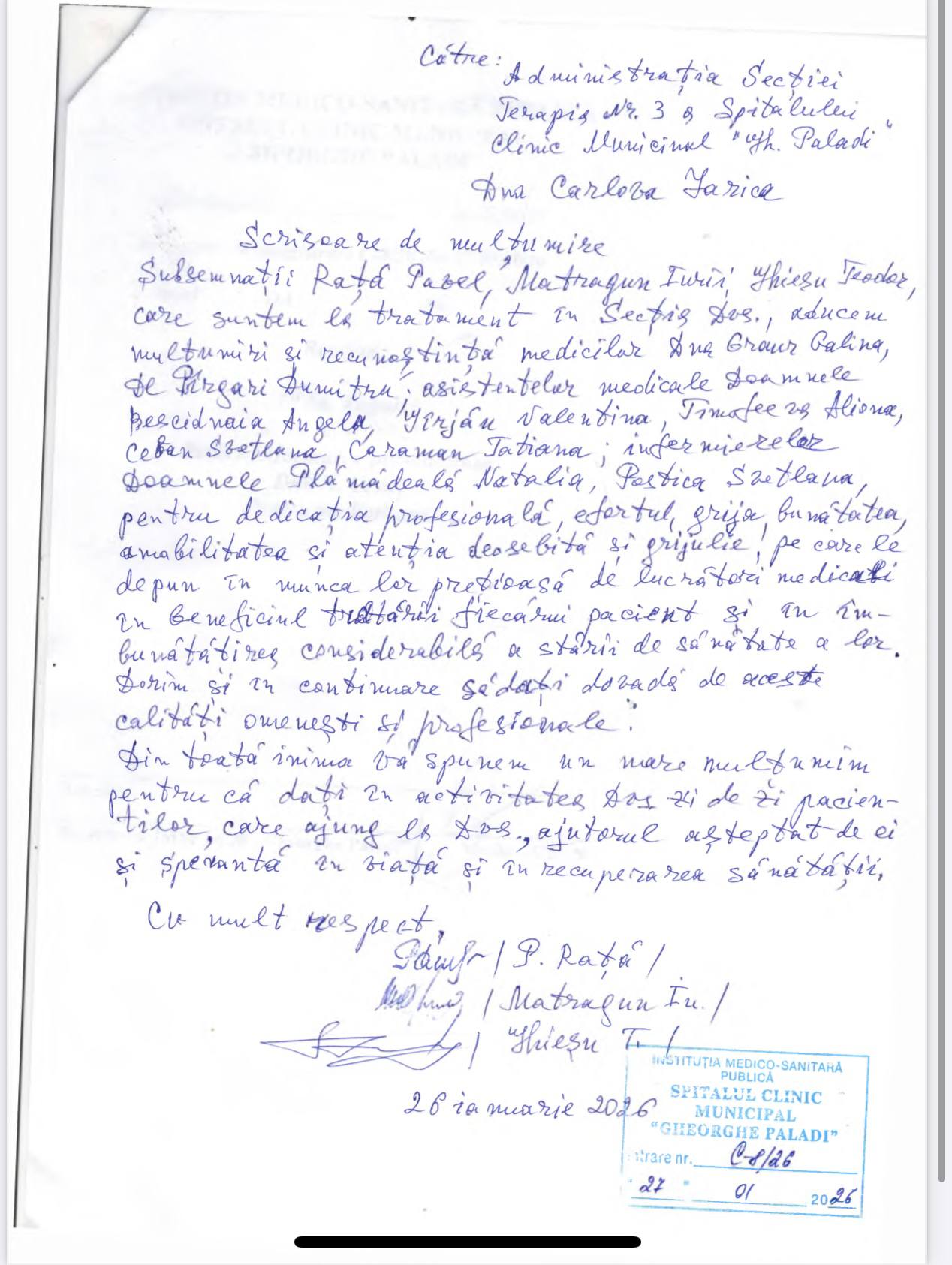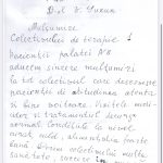 ”Subsemnații Rață Pavel, Matragun Irina, Iliescu Teodor, care suntem la tratament în Secția dvs., aducem mulțumiri și recunoștință medicilor dna Goncear Galina, dr. Pîrgari Dumitru, asistentelor medicale doamnele Besedina Angela, Iurcian Valentina, Timoșciuc Alina, Ceban Svetlana, Caraman Tatiana, infirmierelor doamnele Plămădeală Natalia, Pădurea Svetlana, pentru dedicația profesională, efortul, grija, bunătatea, amabilitatea și atenția deosebită și grijulie pe care le depun în munca lor prețioasă de lucrători medicali în beneficiul tratării fiecărui pacient și în îmbunătățirea considerabilă a stării de sănătate a lor. Dorim și în continuare să dați dovadă de aceste calități omenești și profesionale. Din toată inima vă spunem un mare mulțumim pentru că dați în activitatea dvs. zi de zi pacienților care ajung la dvs. ajutorul așteptat de ei și speranța în viață și în recuperarea sănătății.”, semnează cu mult respect: Rață P. Matragun Ir. Iliescu T.
