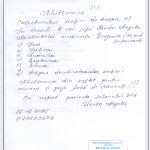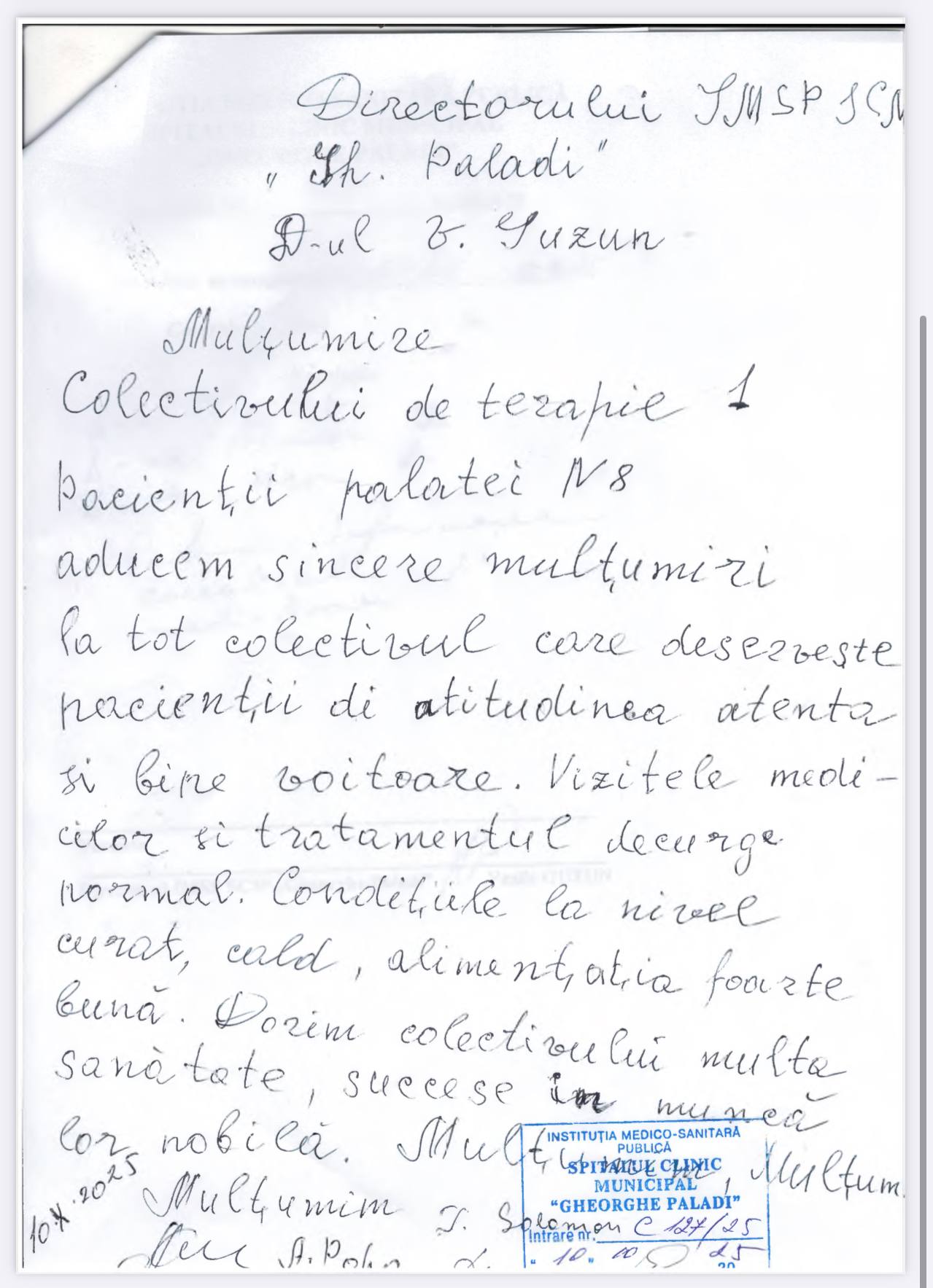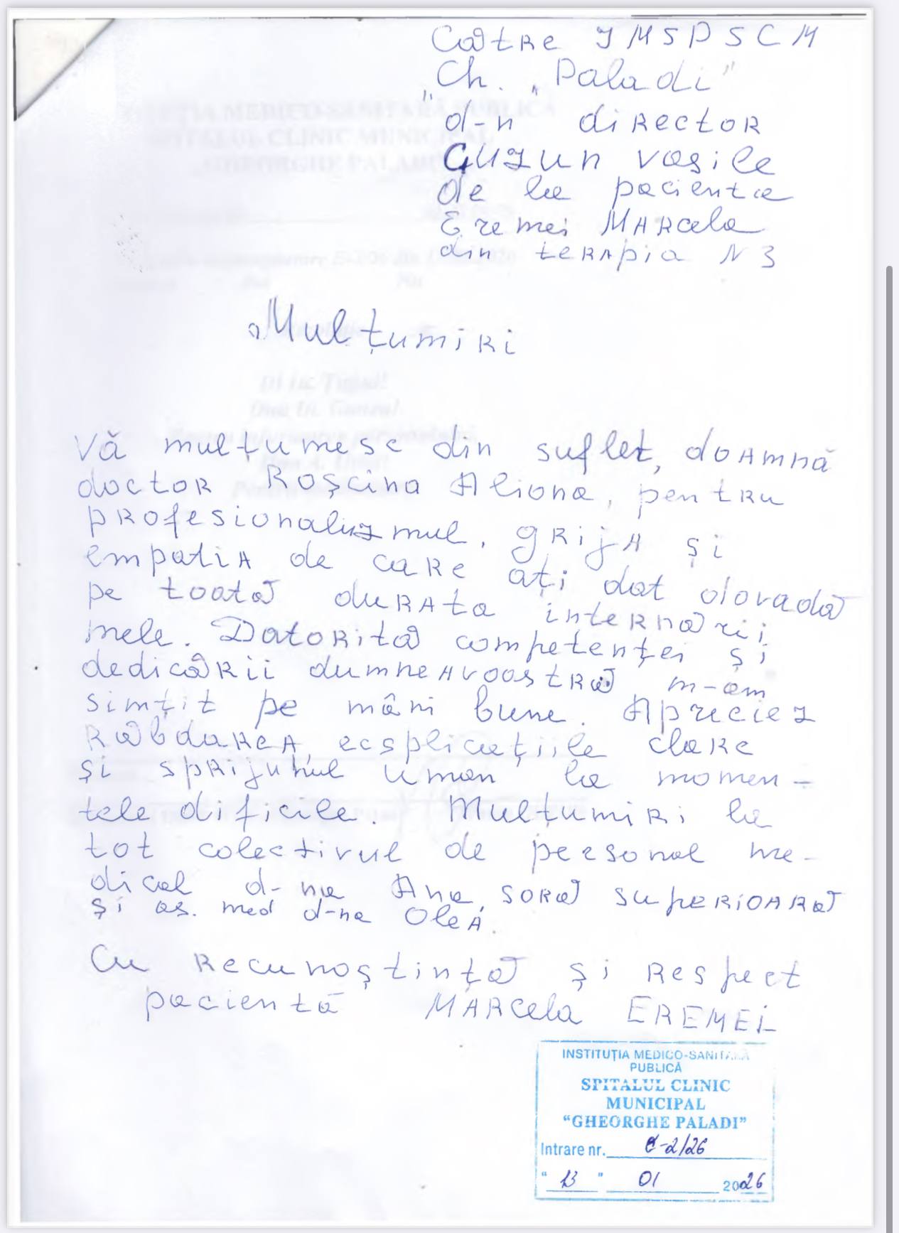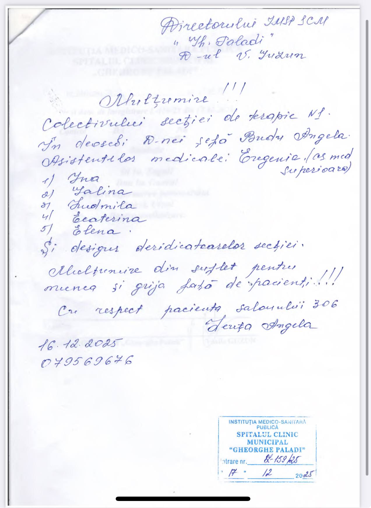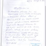 ”Subsemnații Rață Pavel, Matragun Irina, Iliescu Teodor, care suntem la tratament în Secția dvs., aducem mulțumiri și recunoștință medicilor dna Goncear Galina, dr. Pîrgari Dumitru, asistentelor medicale doamnele Besedina Angela, Iurcian Valentina, Timoșciuc Alina, Ceban Svetlana, Caraman Tatiana, infirmierelor doamnele Plămădeală Natalia, Pădurea Svetlana, pentru dedicația profesională, efortul, grija, bunătatea, amabilitatea și atenția deosebită și grijulie pe care le depun în munca lor prețioasă de lucrători medicali în beneficiul tratării fiecărui pacient și în îmbunătățirea considerabilă a stării de sănătate a lor. Dorim și în continuare să dați dovadă de aceste calități omenești și profesionale. Din toată inima vă spunem un mare mulțumim pentru că dați în activitatea dvs. zi de zi pacienților care ajung la dvs. ajutorul așteptat de ei și speranța în viață și în recuperarea sănătății.”, semnează cu mult respect: Rață P. Matragun Ir. Iliescu T.